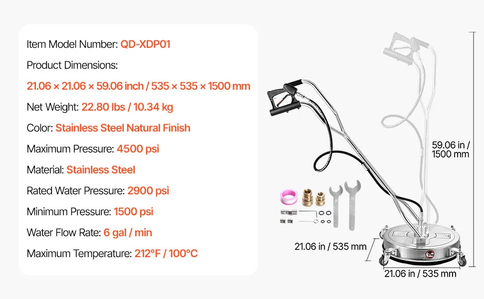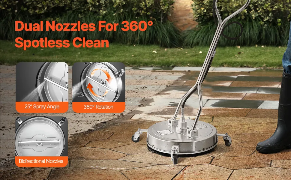 VEVOR Idropulitrice per Superfici in Acciaio Inossidabile con 4 Ruote, 275,8 bar Max, Connettore Rapido da 3/8, 2 Ugelli di Spruzzo, Doppia Impugnatura, per Cemento, Patio, Marciapiede 535 mm