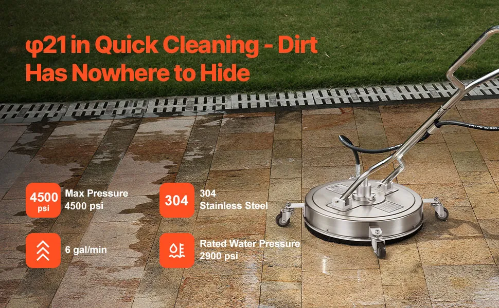 φ21 pollici Rapido ed efficiente: pulisci di più, più velocemente. Con una potente portata di 6 gal/min, questa idropulitrice per superfici da φ21 pollici pulisce ogni centimetro, rendendola ideale sia per grandi lavori che per la pulizia quotidiana. Porta a termine il lavoro in modo rapido e senza sforzo, risparmiando tempo ed energia