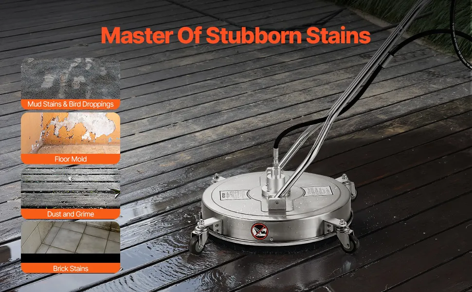 Dalle macchie di fango, escrementi di uccelli sui pavimenti, alle macchie di mattoni, questa idropulitrice per superfici gestisce tutto in una volta, senza bisogno di strofinare ripetutamente. Di' addio alle difficoltà con le macchie ostinate e alla preoccupazione per lo sporco.