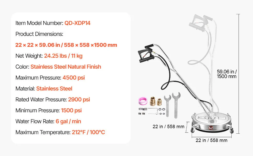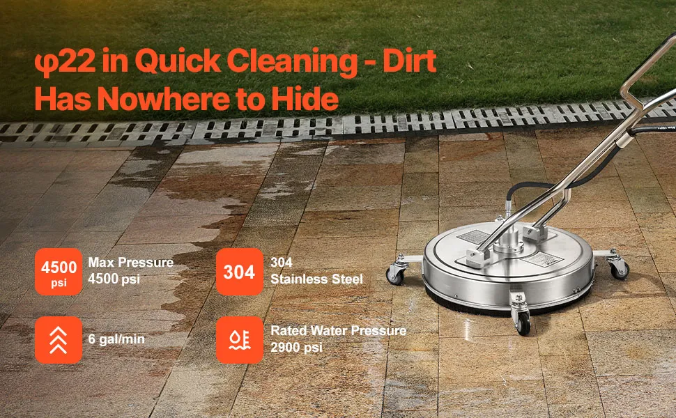 φ22 pollici Rapido ed efficiente: pulisci di più, più velocemente. Con una potente portata di 6 gal/min, questa idropulitrice per superfici da φ22 pollici pulisce ogni centimetro, rendendola ideale sia per grandi lavori che per la pulizia quotidiana. Porta a termine il lavoro in modo rapido e senza sforzo, risparmiando tempo ed energia