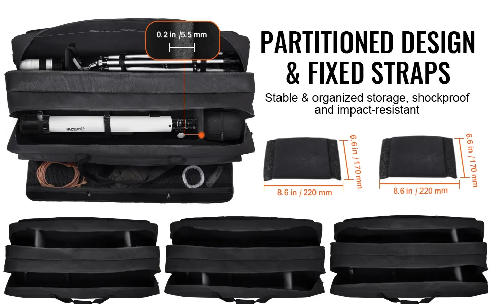 Artigianato superiore: quattro cinghie di sicurezza all'interno della borsa del telescopio impediscono che gli oggetti cadano e aumentano notevolmente la stabilità complessiva della custodia. La cerniera liscia assicura un accesso rapido e facile. La tracolla staccabile offre più opzioni di trasporto e aumenta la flessibilità.