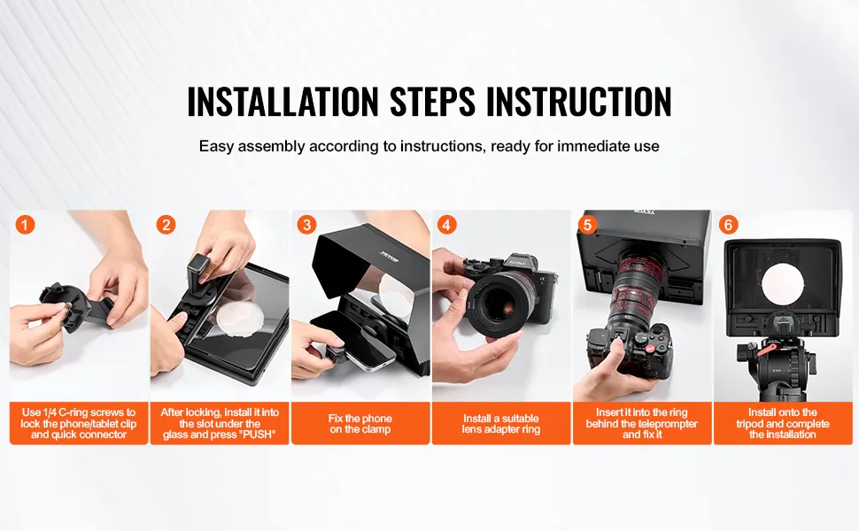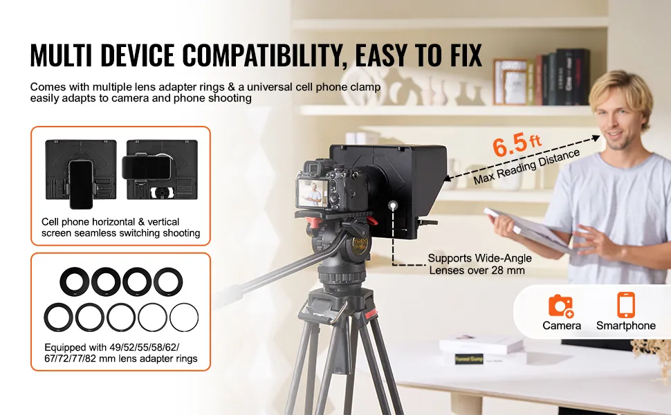 Viene fornito con un anello adattatore per obiettivo multi-dimensione e un morsetto universale per telefono, che consente al teleprompter di adattarsi facilmente alle riprese con fotocamera e telefono e di passare facilmente dallo schermo orizzontale a quello verticale del telefono.