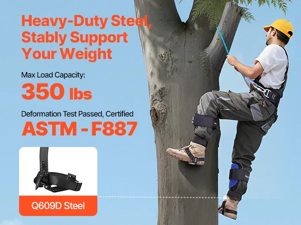 Telaio in acciaio ad alta resistenza: realizzati in acciaio Q609D, gli speroni per l'arrampicata sugli alberi supportano fino a 150 kg. Testati secondo la norma ASTM-F887 per la deformazione, garantiscono la sicurezza di ogni arrampicata