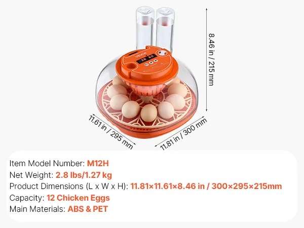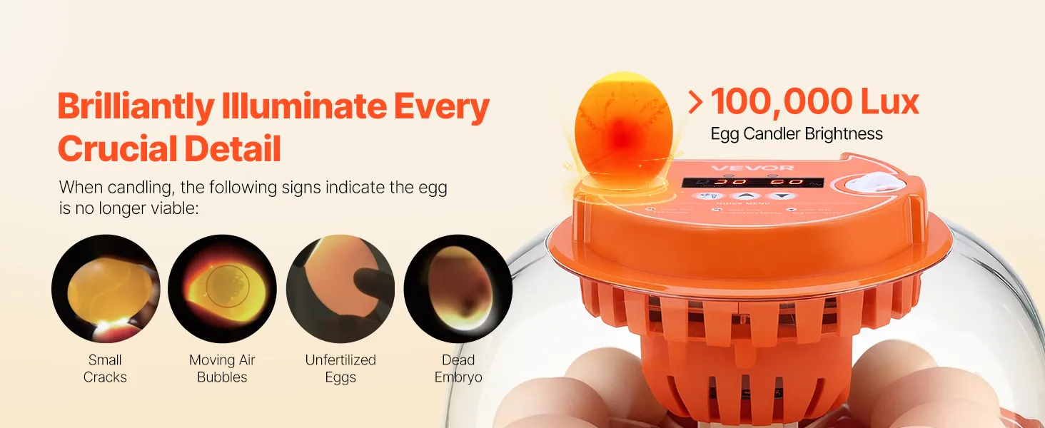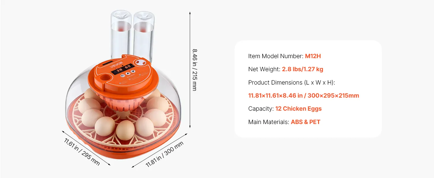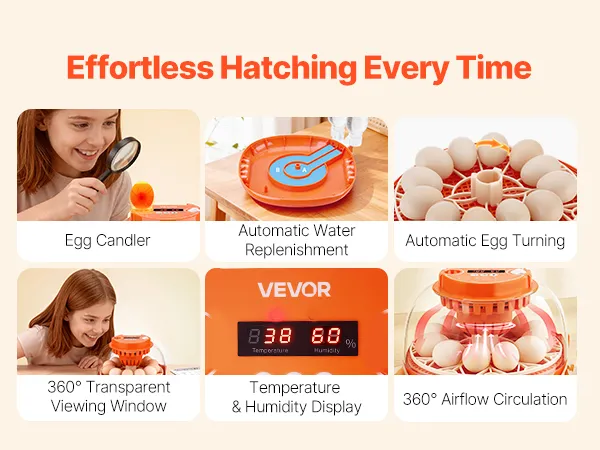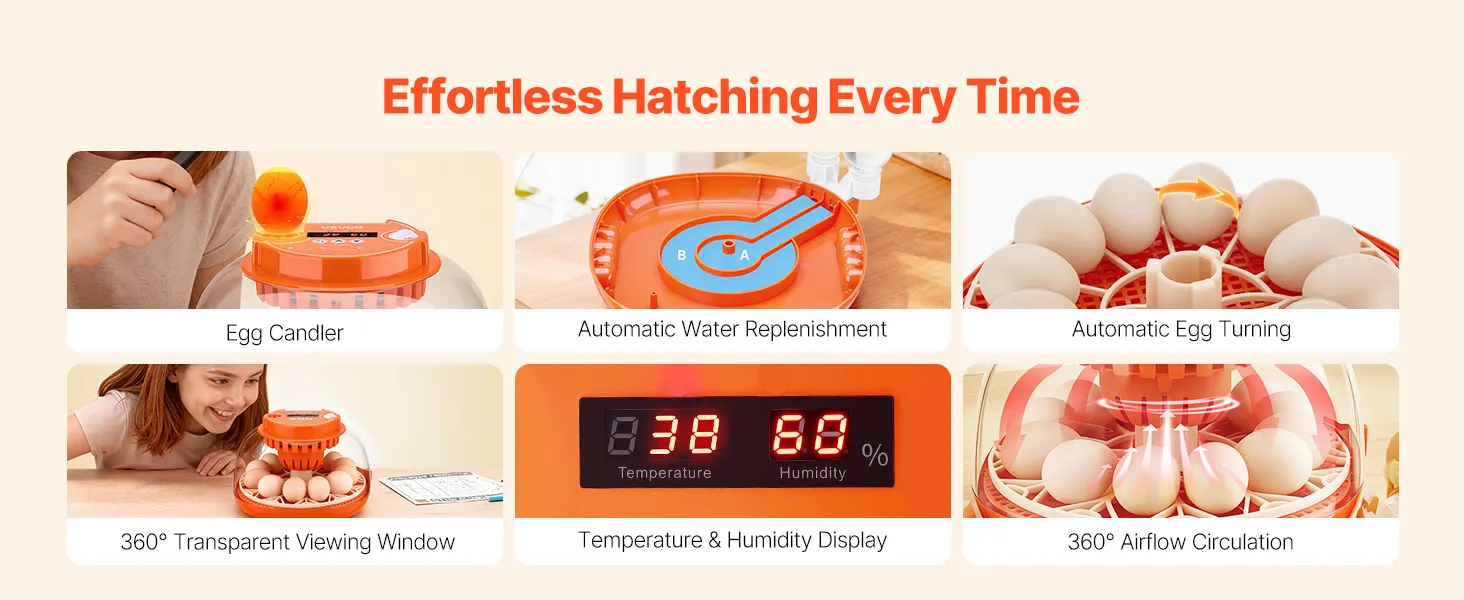 VEVOR Incubatrice da 12 Uova con Candela a LED, Display della Temperatura e Controllo Automatico dell'Umidità, Finestra Trasparente con Vista a 360°, per la Schiusa di Pulcini, Anatre, Oche