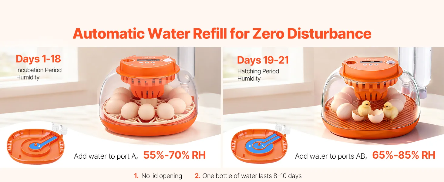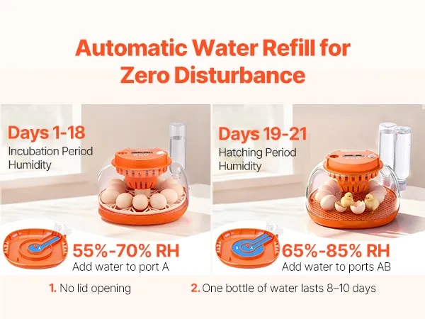 Ricarica automatica dell'acqua: l'incubatrice per uova è dotata di un sistema di ricarica automatica a doppia zona AB, consente di aggiungere acqua senza aprire il coperchio. Una bottiglia dura 8-10 giorni, riducendo al minimo le ricariche manuali