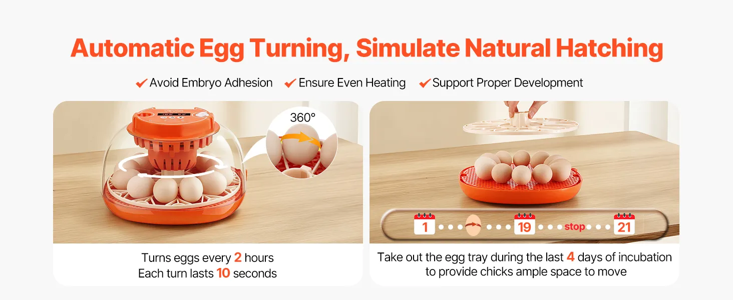 Girauova automatico: progettata per imitare la delicata cura di una chioccia, questa incubatrice per la schiusa delle uova gira automaticamente le uova ogni 2 ore per 10 secondi. Evita l'adesione degli embrioni