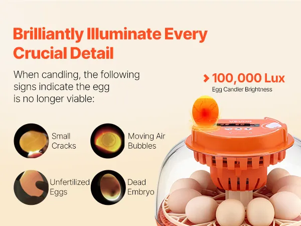 Spellauova e finestra di visualizzazione a 360°: il nostro girauova automatico è dotato di uno spellauova ad alta luminosità da 10 W Lux per una facile ispezione degli embrioni. La finestra di visualizzazione trasparente a 360°