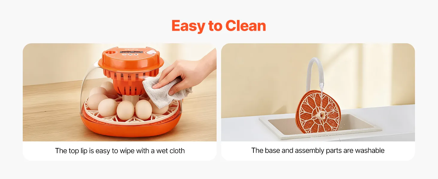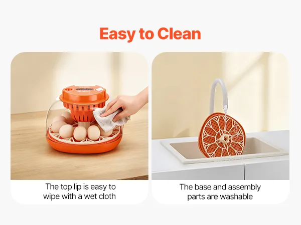 Facile da usare e da pulire: grazie al suo design semplice, questa incubatrice per uova d'anatra è facile da usare anche per i principianti. Il coperchio superiore può essere pulito con un panno umido, mentre la base e i componenti sono lavabili