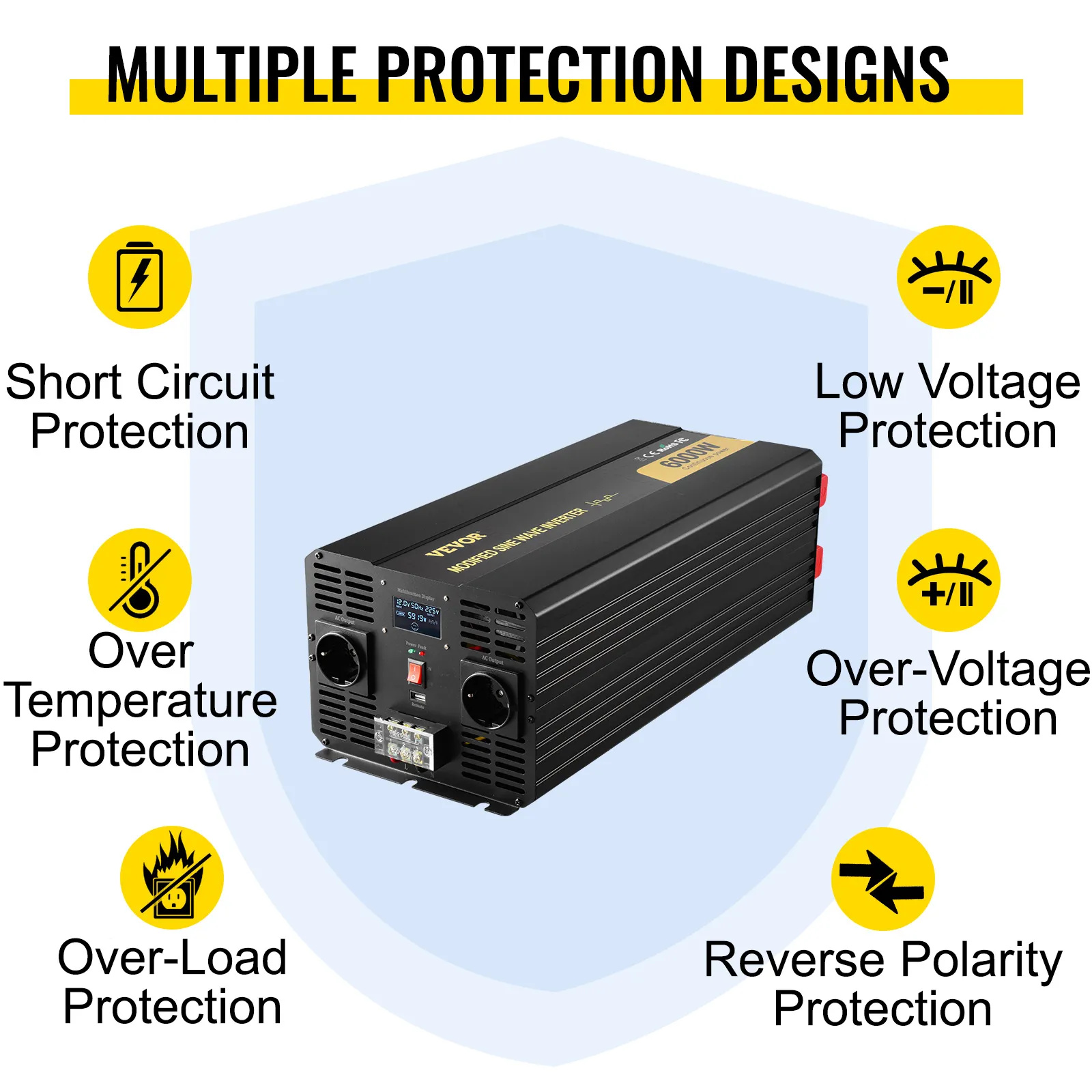 Esistono sei misure di protezione principali per un inverter: protezione da cortocircuito, protezione da sovratemperatura, protezione da sovraccarico, protezione da bassa tensione, protezione da sovratensione, protezione da inversione di polarità.