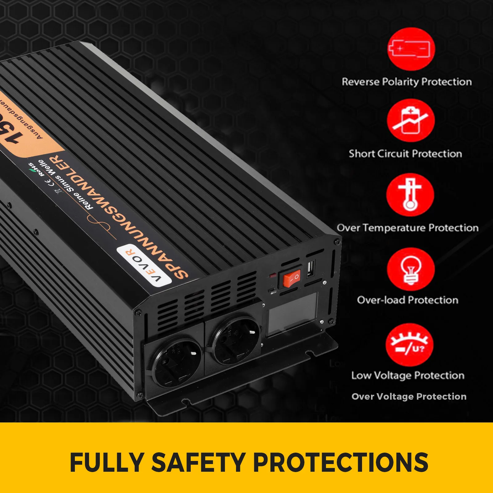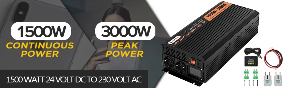 Generatore inverter a onda sinusoidale da 1500 W 24 V CC a 230 V CA, potenza continua 1500 W, potenza di picco 3000 W, per tensioni CA CC.