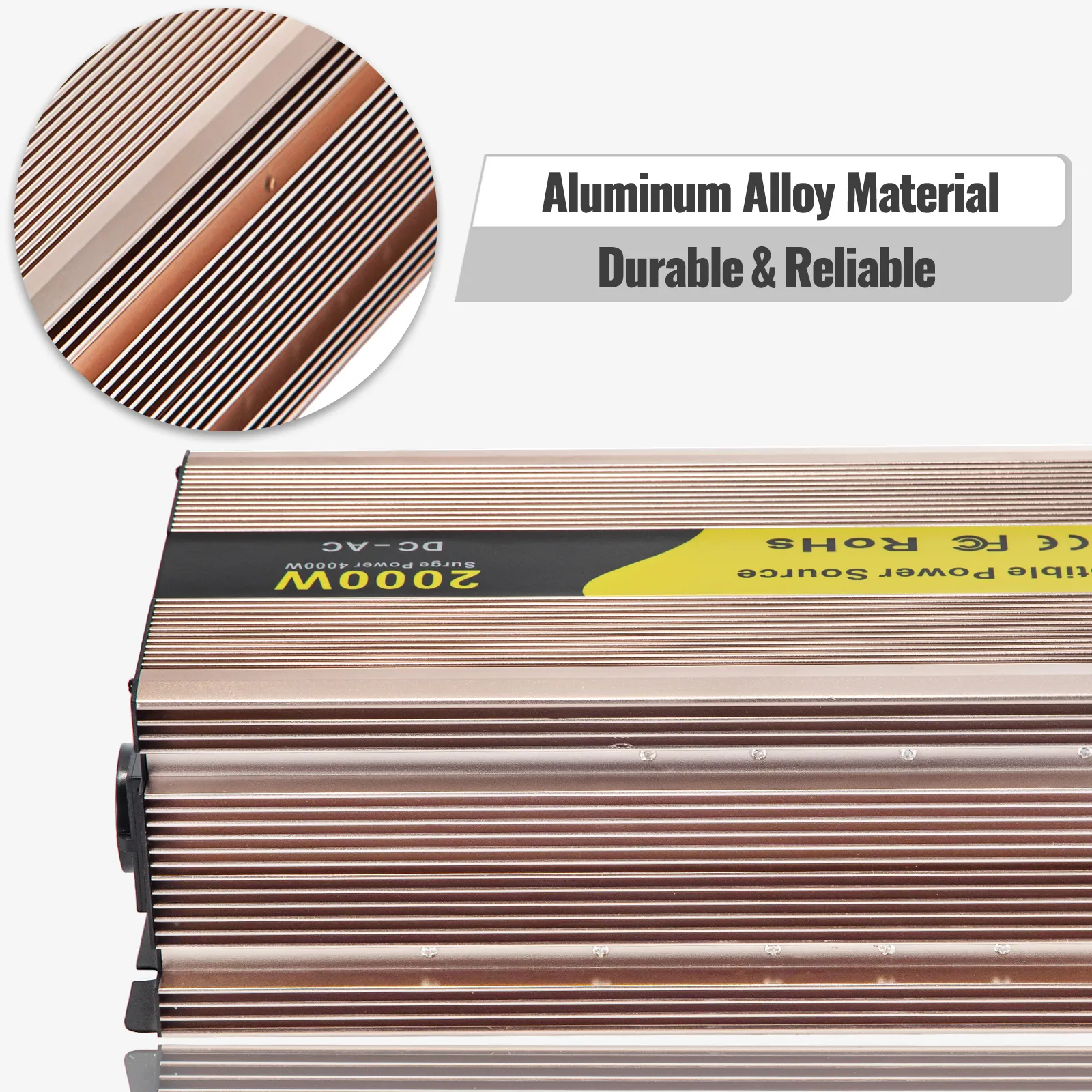 • 【GUSCIO IN LEGA DI ALLUMINIO E LED】 - L'invertitore a onda sinusoidale pura da 2000 W adotta un guscio in lega di alluminio per resistere al calore, al freddo e alla corrosione, che non è facile da arrugginire. Lo schermo LCD e gli indicatori LED consentono agli utenti di controllare prontamente il funzionamento dell'invertitore.