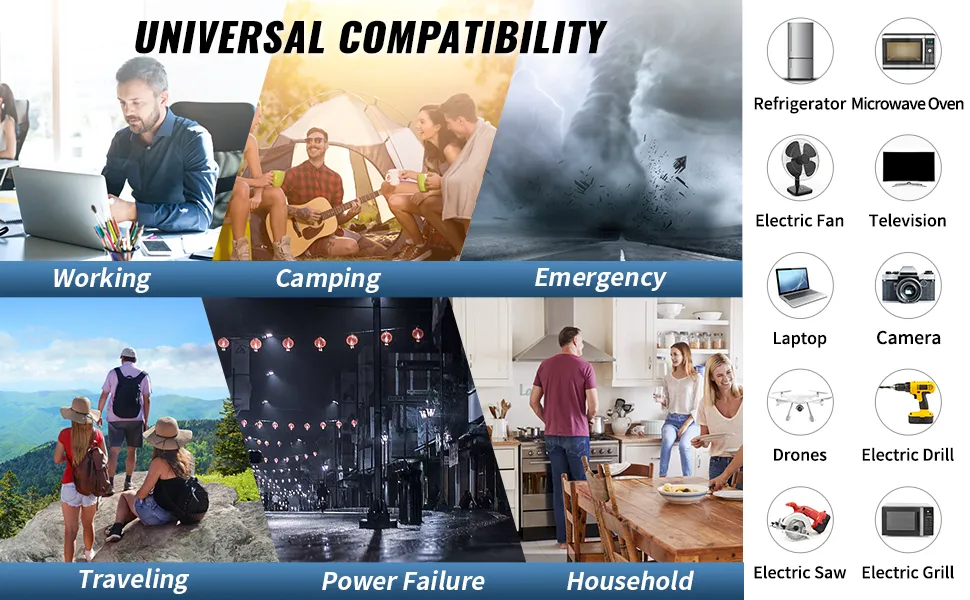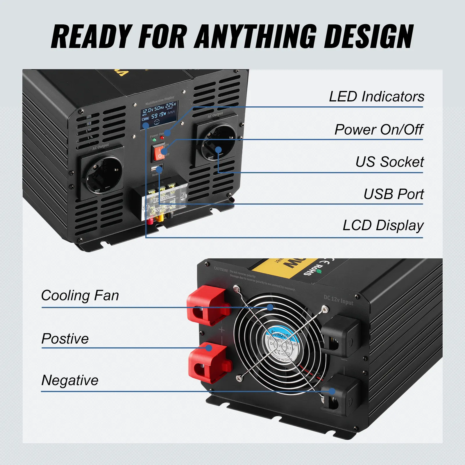 Sei pronto ad alimentare con sicurezza i tuoi dispositivi elettronici? Questo inverter a onda sinusoidale pura è altamente raccomandato per apparecchiature elettroniche sensibili che richiedono un'alimentazione CA più pulita per funzionare in modo efficace. Il display LCD chiaro, la ventola di raffreddamento intelligente e le protezioni multiple forniscono una conversione di potenza affidabile in dimensioni compatte e alta efficienza. Ti consente di alimentare più dispositivi come laptop, ventole, frigoriferi, forni a microonde, computer notebook, alimentatori a commutazione, macchine per il caffè, ecc. Accendiamolo insieme!