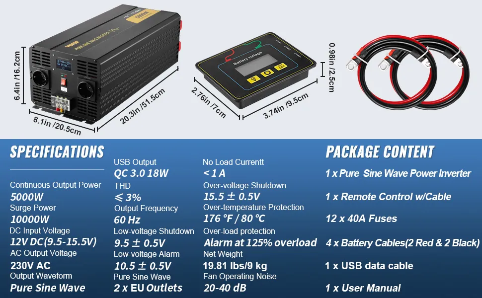 Potente telecomando: questo inverter a onda sinusoidale pura è dotato di un telecomando LCD in plastica di alta qualità, costruito in modo robusto per resistere ai danni. È dotato di un cavo lungo 9,8 piedi/3 m, che ti consente di controllare l'inverter da lontano. Tipo di connessione del telecomando: 6P6C. 12 fusibili da 40 A e 4 cavi per batteria forniti.