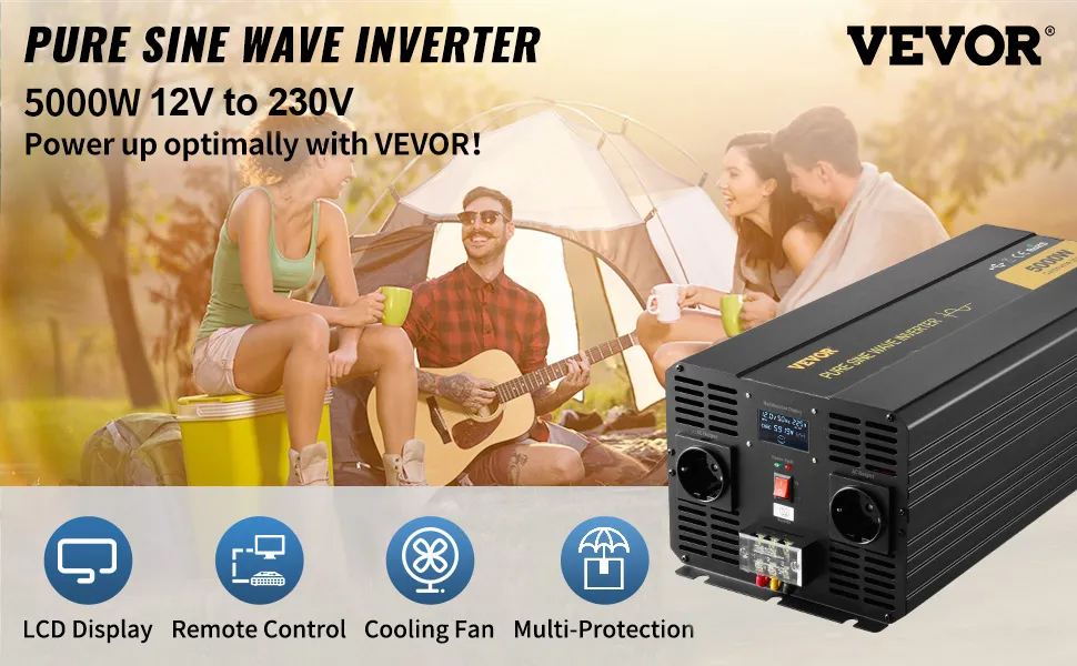 VEVOR Invertitore a Onda Sinusoidale Pura, 5000 W Invertitore di Potenza, DC 12 V a AC 230 V Invertitore per Auto con Schermo LCD Porta USB, Telecomando, per Camper Sistema Solare Viaggio Campeggio