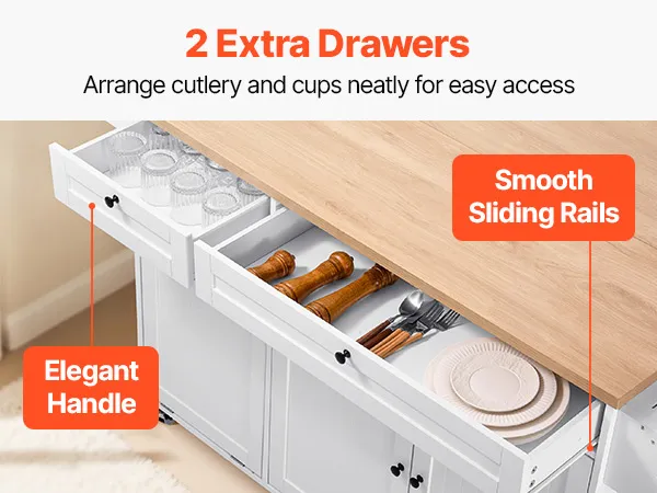 Questa isola da cucina è dotata di meccanismi di chiusura ammortizzata e il cassetto garantisce un funzionamento fluido e silenzioso, mantenendo gli oggetti importanti in ordine e a portata di mano.