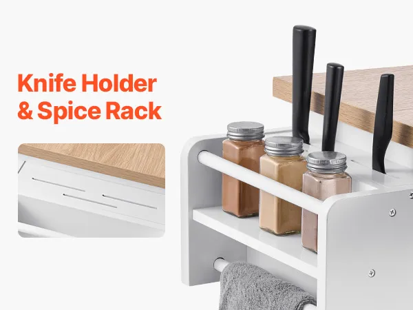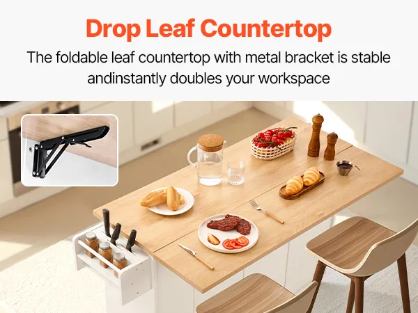 Piano di lavoro pieghevole: il piano di lavoro pieghevole della tua isola cucina amplia senza sforzo lo spazio di lavoro. Tre robuste staffe metalliche garantiscono stabilità e si ripiegano senza problemi quando non vengono utilizzate, sfruttando al meglio lo spazio in cucina