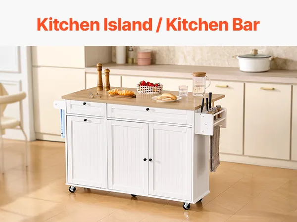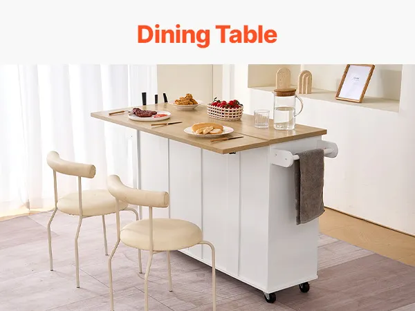 Questa versatile isola da cucina combina ripiani, contenitori e mobili per organizzare con facilità pentole, posate e articoli per la dispensa. Le ruote scorrevoli scorrono senza sforzo sul pavimento, consentendo un facile passaggio dal piano di lavoro della cucina alla zona pranzo.
