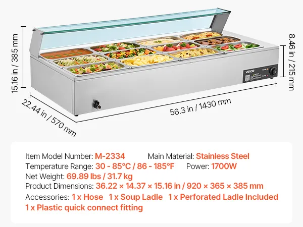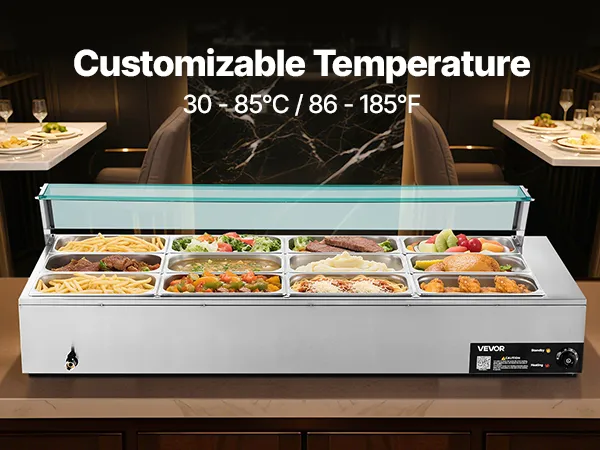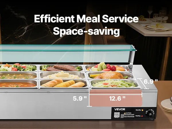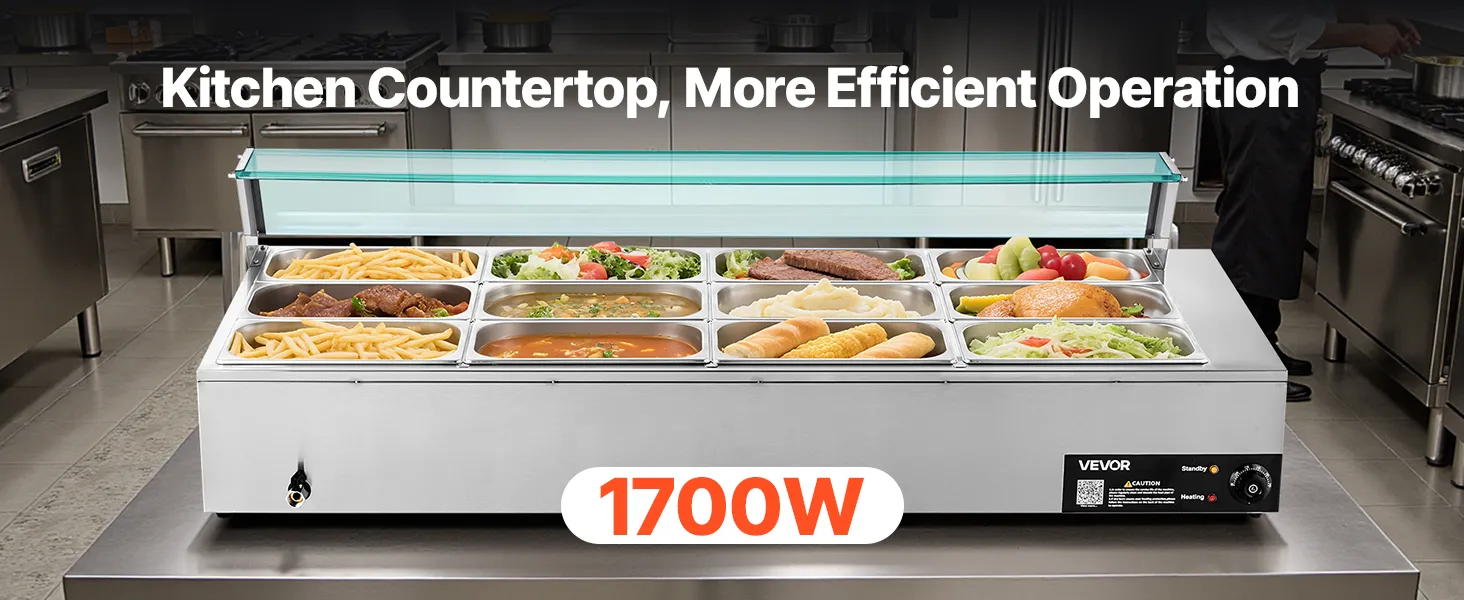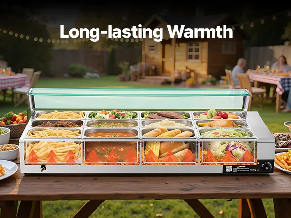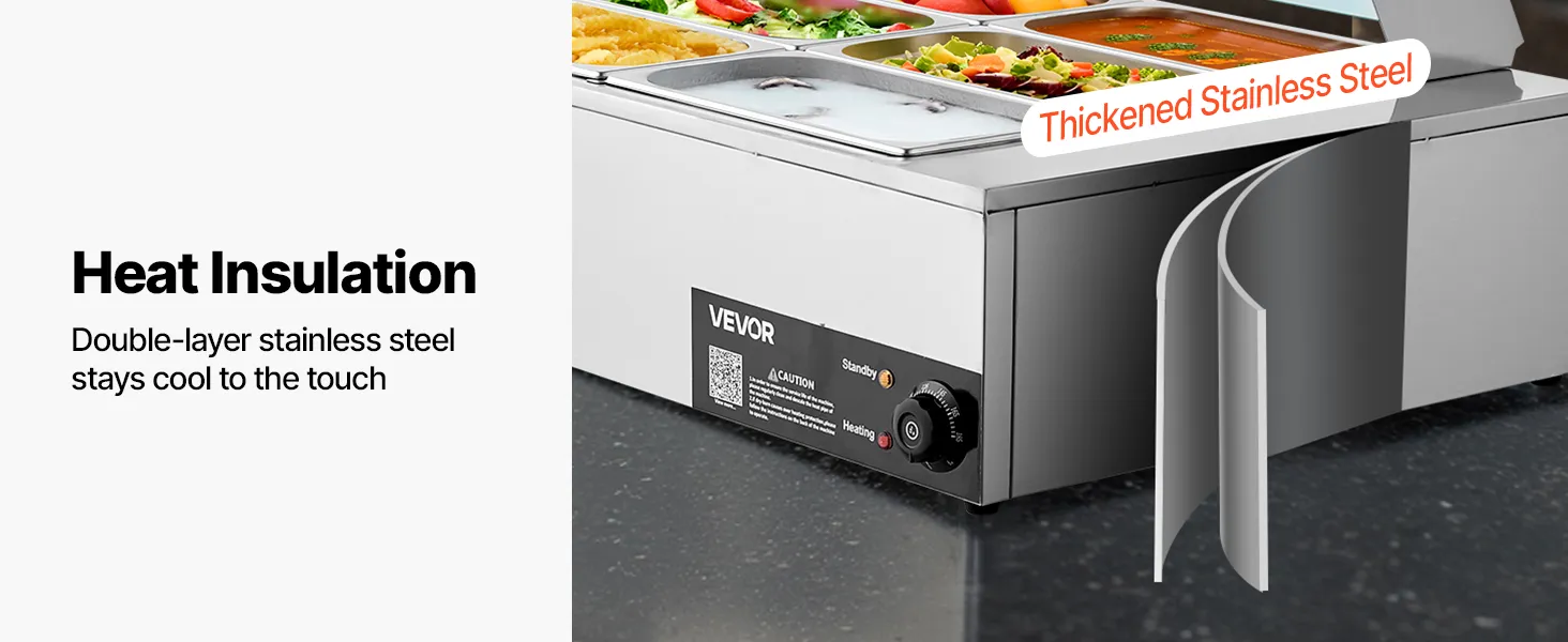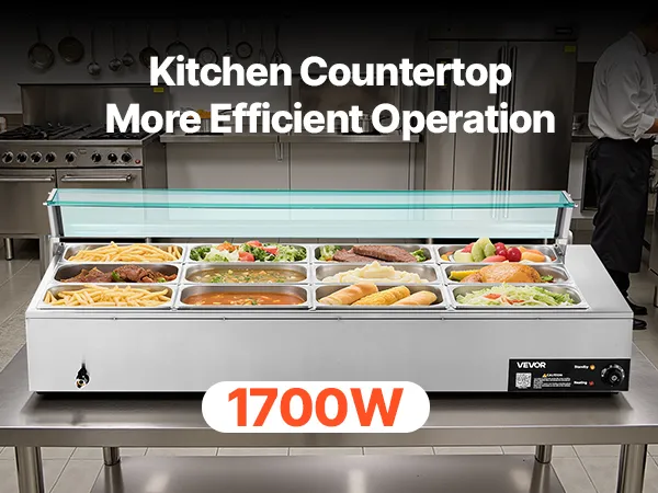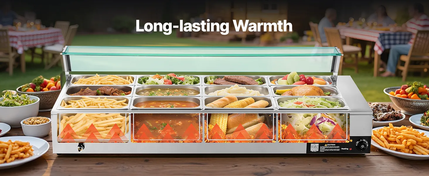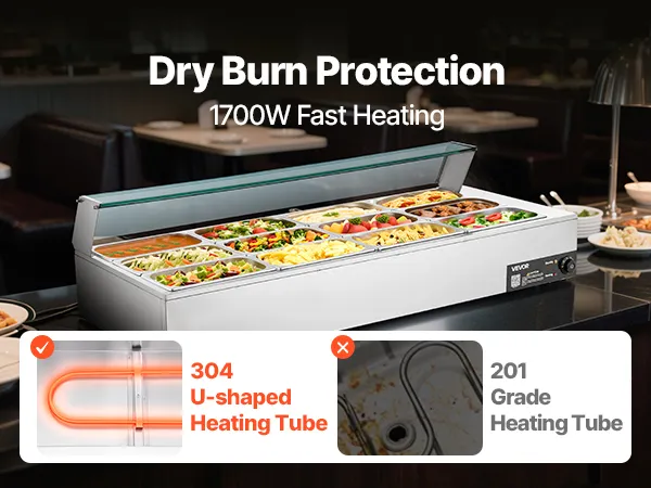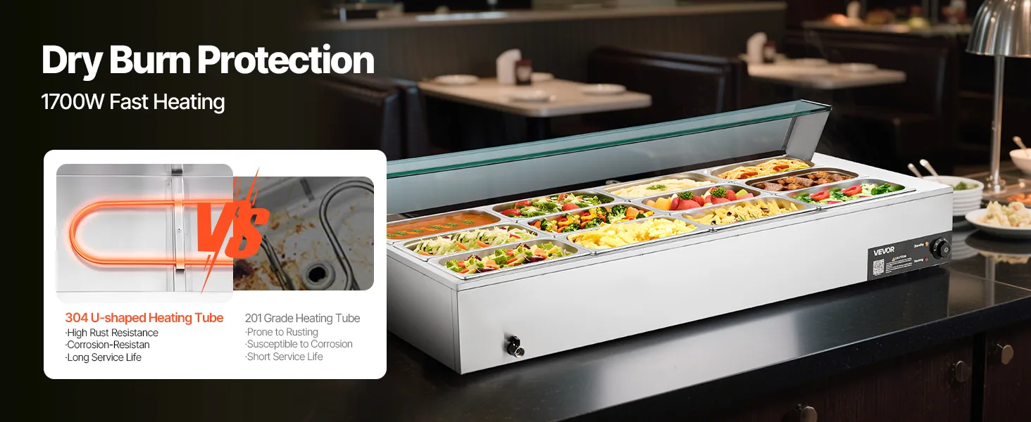 Riscaldamento rapido e uniforme: dotato di un potente tubo riscaldante in acciaio inossidabile da 1700 W, questo scaldavivande commerciale riscalda rapidamente gli alimenti per mantenerne freschi i sapori