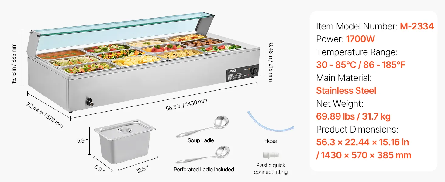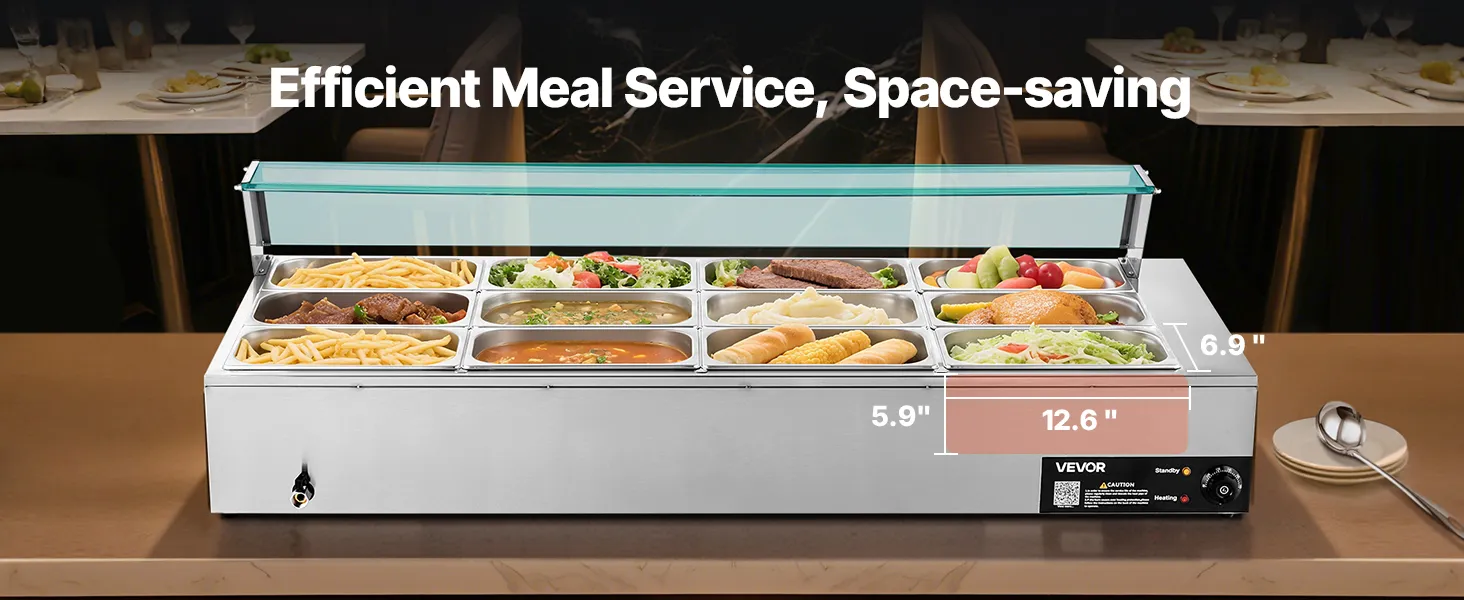 VEVOR Scaldavivande Commerciale, Scaldavivande Elettrico in Acciaio Inox da 1700 W con Coperchio in Vetro, Bagnomaria da Banco a 12 Teglie, con Mestoli per Zuppa e Forati, per Ristoranti
