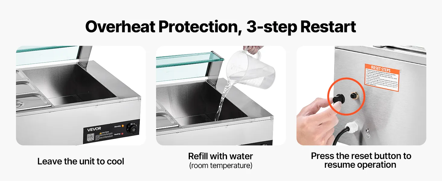 Funzione Smart Stop: quando la temperatura supera i 120 °C (248 °F), lo scaldavivande smette di riscaldare automaticamente. Evitare di versare acqua ghiacciata, che può danneggiare il tubo riscaldante