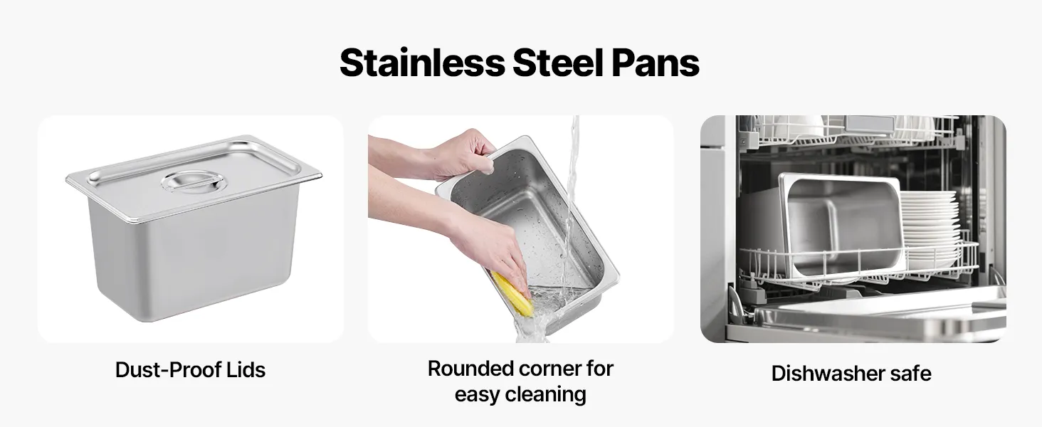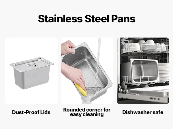 Combo Ampio Spazio: Con una profondità standard di 14 cm, questo bagnomaria a buffet è dotato di 12 teglie da 1/3 di pollice che si adattano a tutti gli scomparti da 14 cm di profondità. Puoi combinarle o scambiarle facilmente