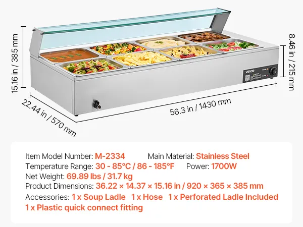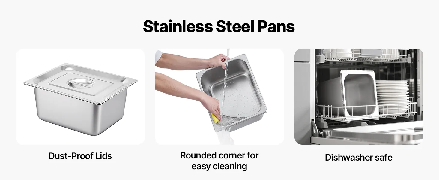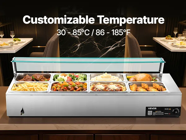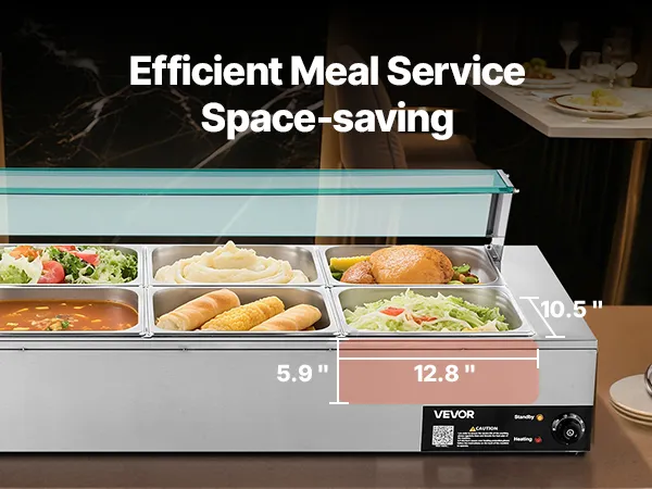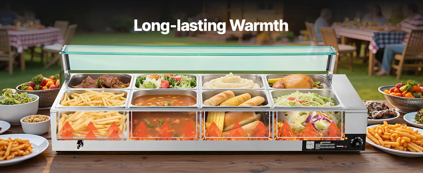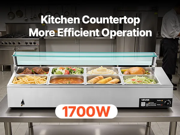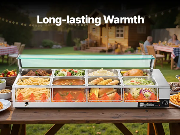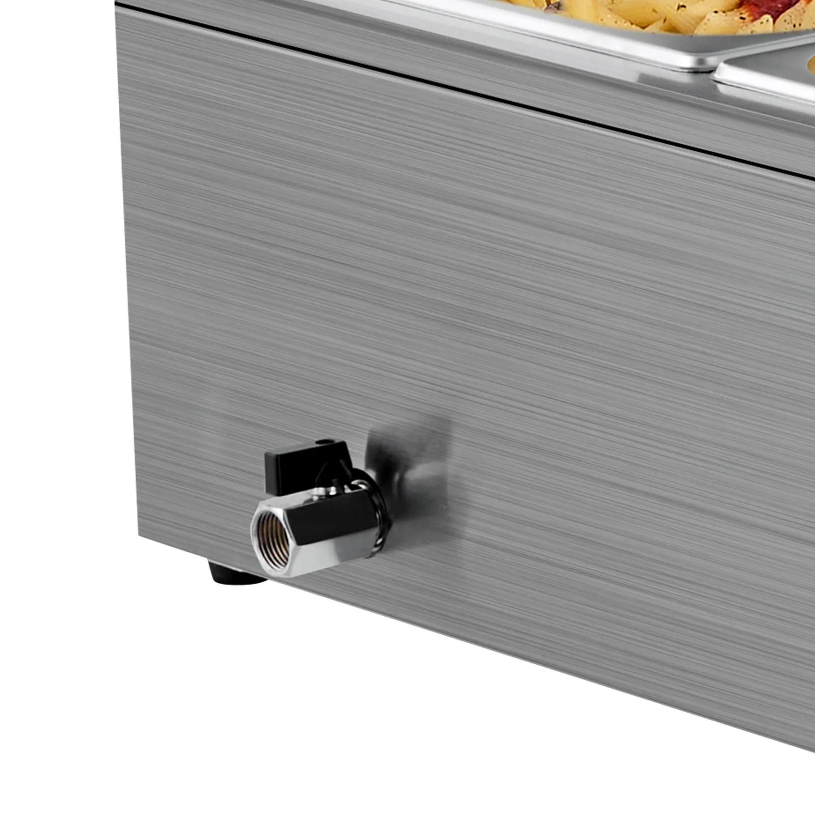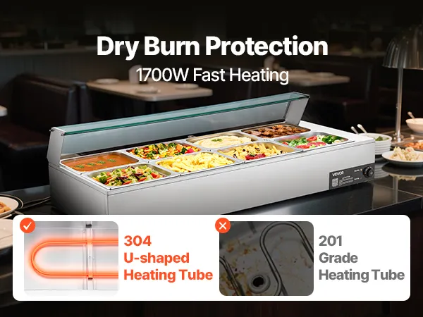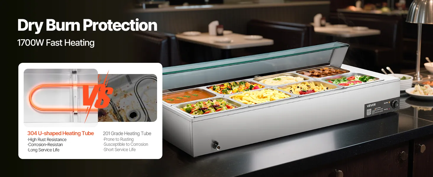 Riscaldamento rapido e uniforme: dotato di un potente tubo riscaldante in acciaio inossidabile da 1700 W, questo scaldavivande commerciale riscalda rapidamente gli alimenti per mantenerne freschi i sapori