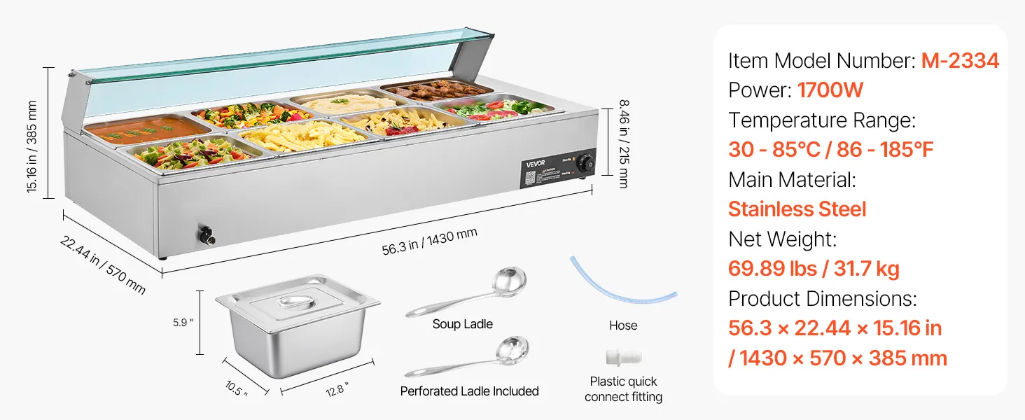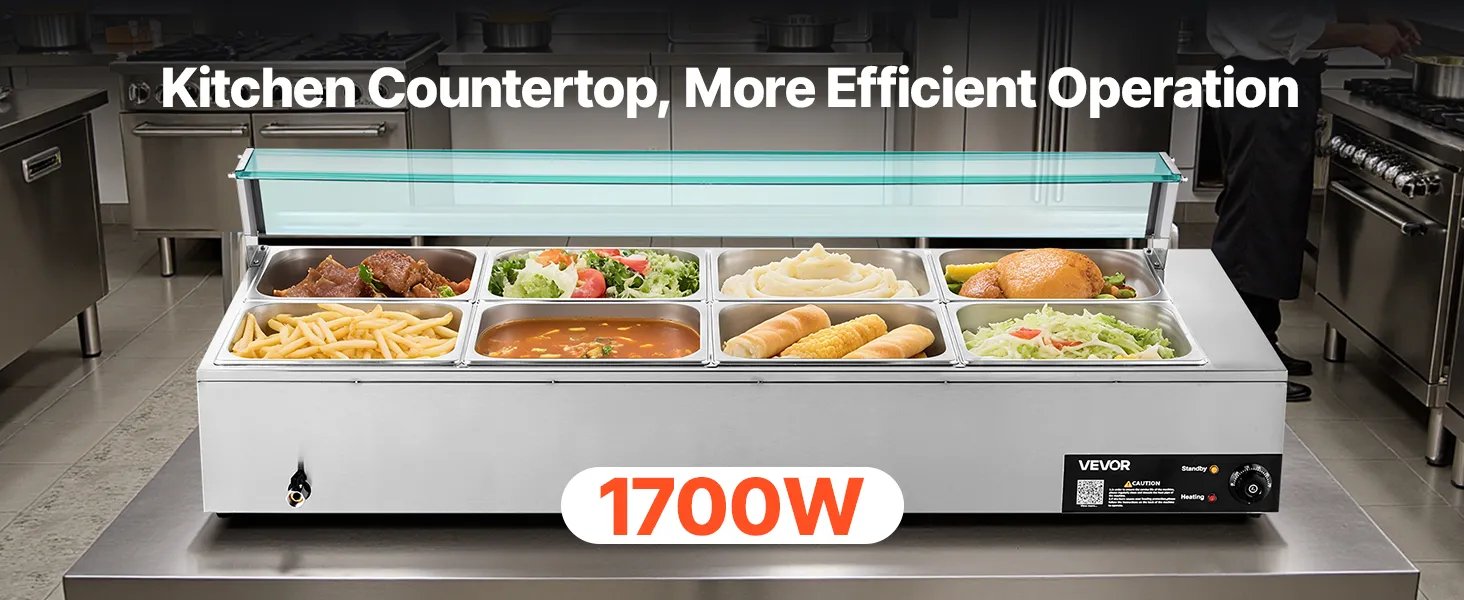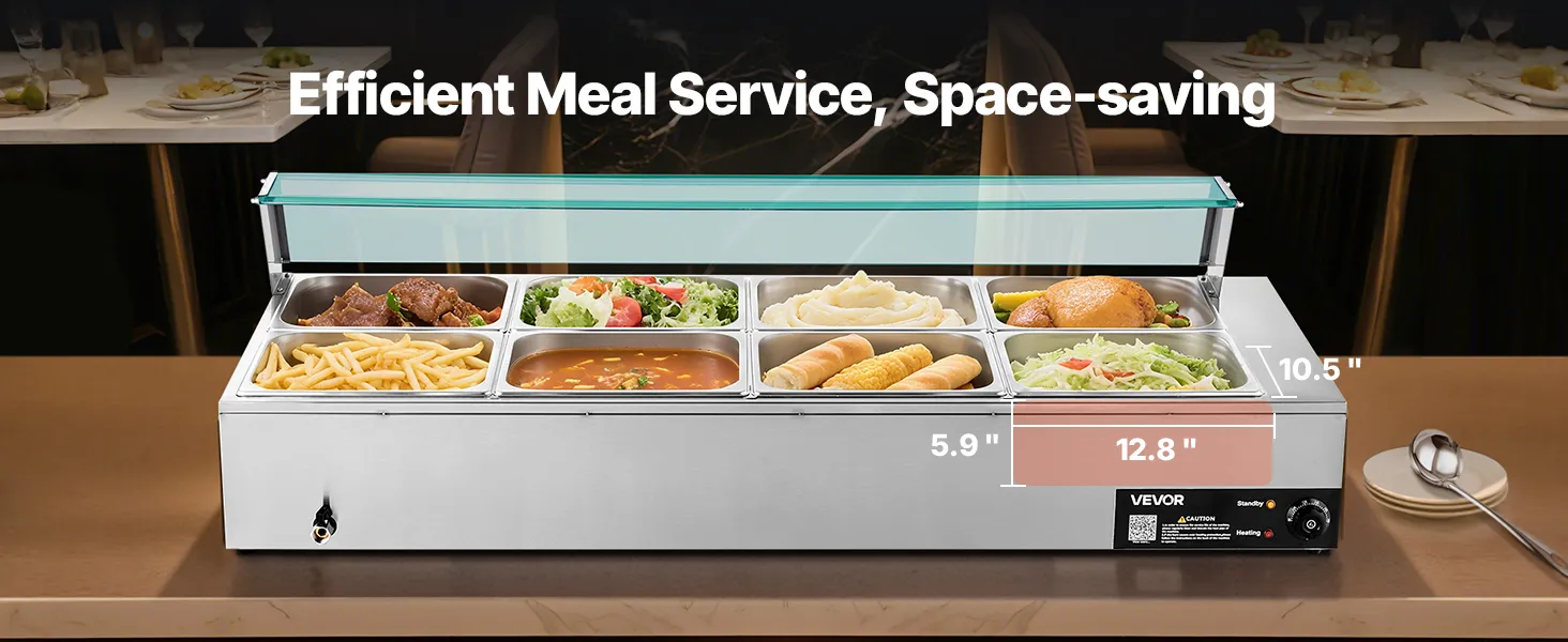VEVOR Scaldavivande Commerciale, Scaldavivande Elettrico in Acciaio Inox da 1700 W con Coperchio in Vetro, Bagnomaria da Banco a 8 Teglie, con Mestoli per Zuppa e Forati, per Ristoranti
