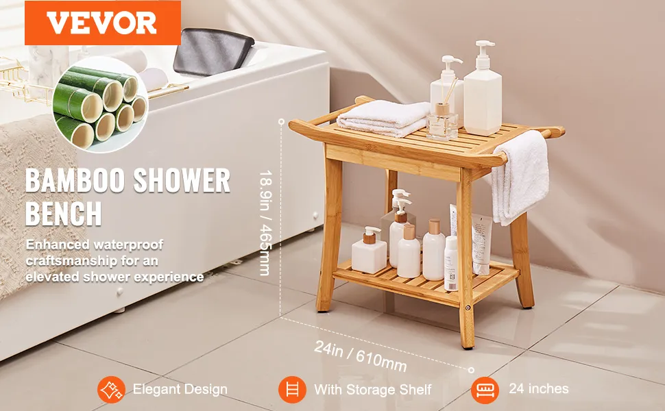 VEVOR Panca da Doccia in Bambù 610 x 350 x 480 mm Sgabello da Doccia Impermeabile con Maniglia per Ripiano, Capacità di 136,1 kg Organizzatore per Sedile da Bagno Idromassaggio, per Adulti Anziani