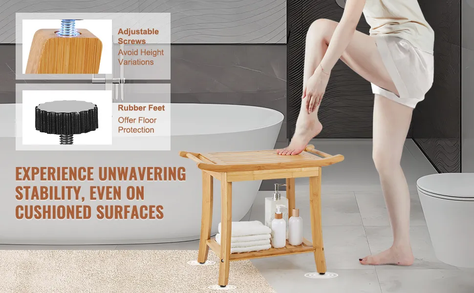 Il nostro sedile per doccia da bagno si adatta facilmente ai pavimenti irregolari. Regola l'altezza con facilità utilizzando viti in acciaio inossidabile, garantendo stabilità e resistenza alla ruggine anche su superfici leggermente inclinate.