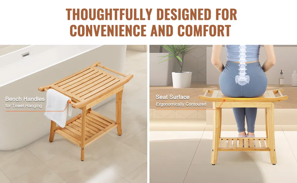 Migliorata con doppie maniglie per una facile mobilità e per appendere gli asciugamani, la nostra panca per doccia in legno di bambù è dotata di un sedile delicatamente sagomato per una comoda postura seduta.