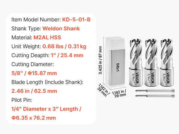 VEVOR Set di Punte per Trapano HSS 5 pezzi, Set Punte per Albero di Trapano Magnetico Diametro di Taglio 15,9 mm con 2 Perni di Centraggio Profondità di Taglio 25,4 mm Acciaio Rapido M2AL