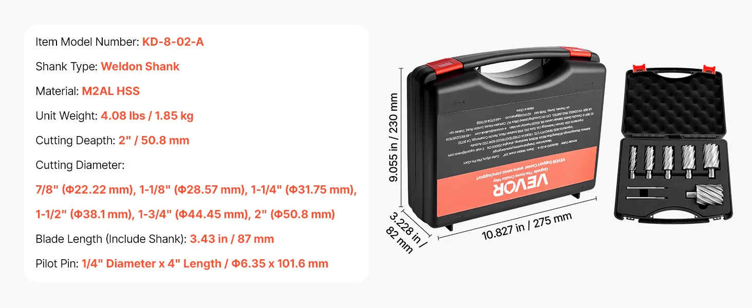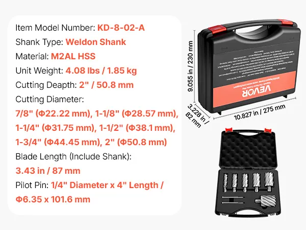 VEVOR Set di Punte per Trapano Magnetiche HSS 8 pezzi, Kit Punte per Avviatore Diametro di Taglio 22,22-50,8 mm, 6 Punte per Trapano di Foratura 2 Perni di Centraggio, Custodia per Trasporto