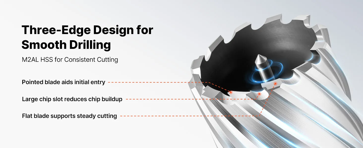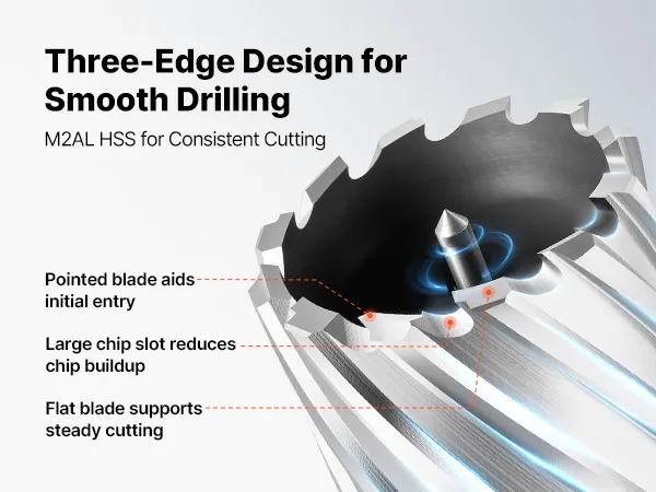 La geometria di taglio e il flusso dei trucioli di queste punte ad anello sono progettati per consentire una foratura uniforme nel metallo.