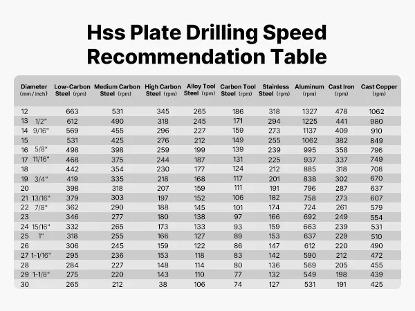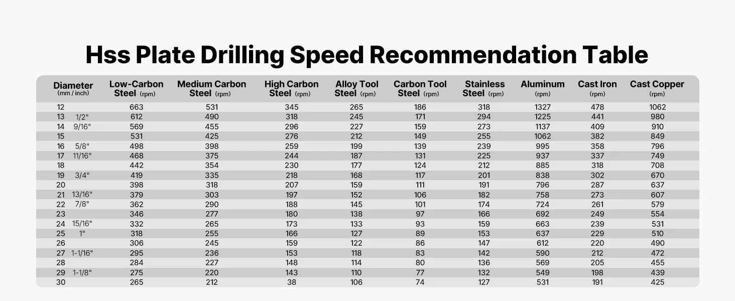 Questa tabella contiene i parametri di velocità per vari materiali e diametri di punta. I valori aiutano a impostare velocità di foratura adeguate e contribuiscono a un processo di foratura più uniforme.