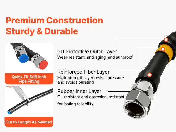 2 tubi flessibili ad alta resistenza da 26 piedi: con una pressione di esercizio massima di 25 MPa, questi tubi di alta qualità resistono a scoppi, piegamenti e perdite sotto carichi pesanti