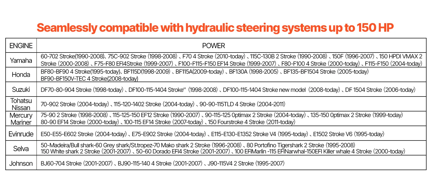Ampia compatibilità con le imbarcazioni: questo kit pompa timoneria idraulica funziona con cruiser, console centrali, motoscafi e barche da pesca d'altura, rendendolo una scelta versatile per un'ampia gamma di configurazioni fuoribordo