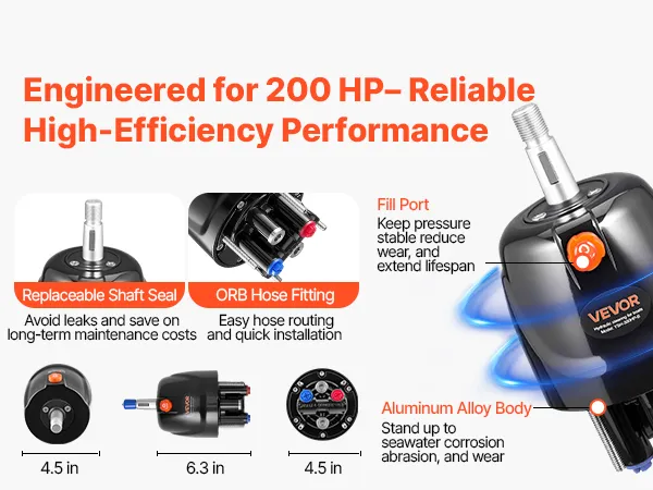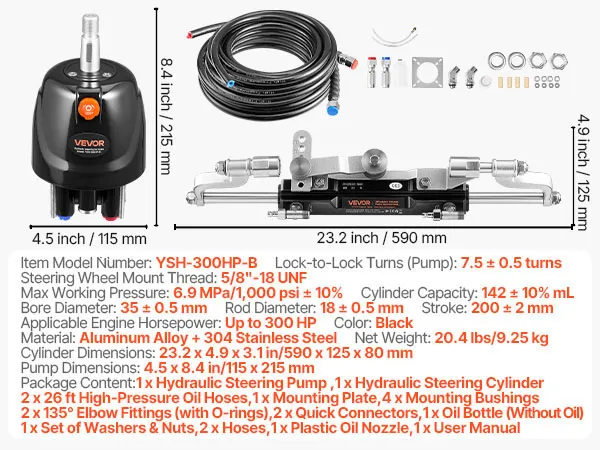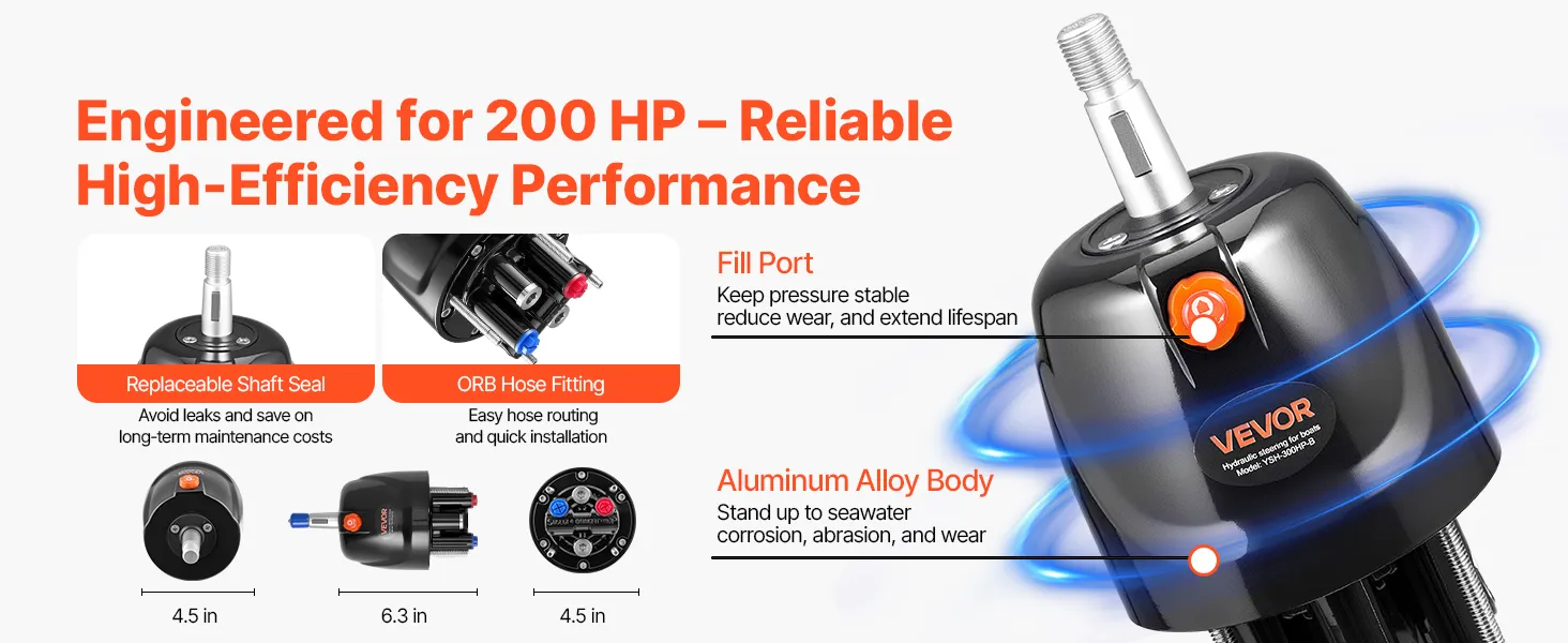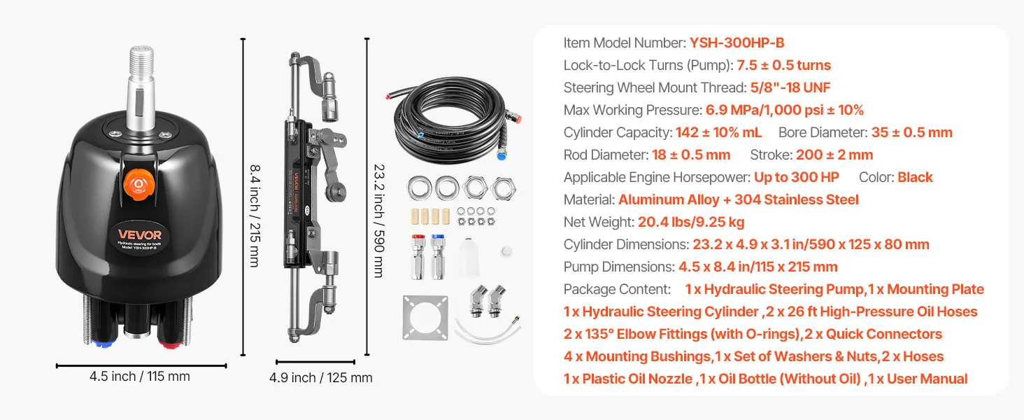 VEVOR Kit di Sterzo Idraulico per Motori Potenza max. 300 CV Sistema di Sterzo Idraulico per Barche, con Pompa del Timone da 1000 PSI Corsa 200 mm Capacità del Cilindro 142mL, Barca, Fuoribordo