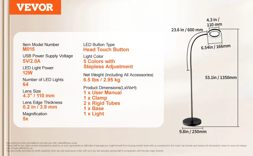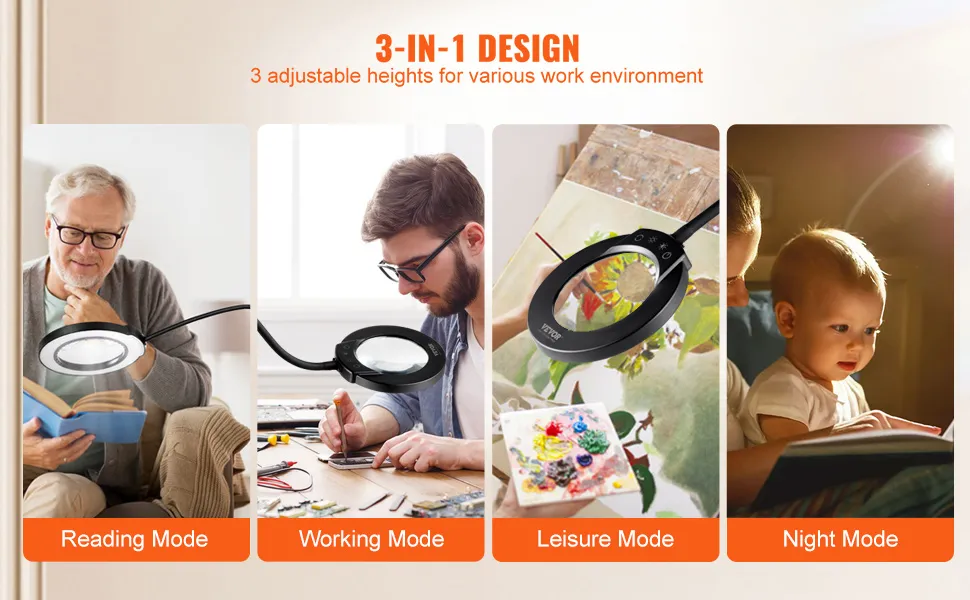 Regolazione dell'altezza a 3 livelli: il palo di supporto offre una regolazione dell'altezza a 3 livelli con un versatile design 3 in 1. Questa lente d'ingrandimento da pavimento con luce può essere utilizzata come lampada da tavolo con morsetto, convertita in una lampada da pavimento.