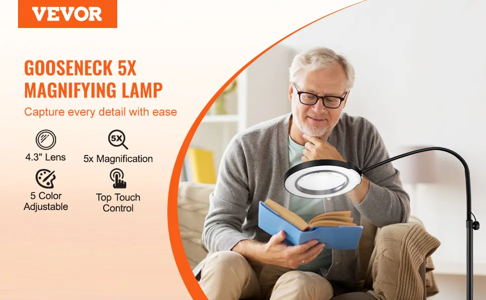 VEVOR Lampada da Terra con Ingrandimento con Luce, Lente d'Ingrandimento da Terra 5X, Collo d'Oca Flessibile, Regolabile Altezza, LED 3 in 1, 5 Modalità di Colore, Dimmerabile in Continuo, per Lettura