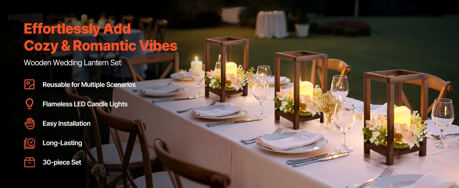 VEVOR Set Lanterna Portacandele Decorativa in Legno 10 Pezzi Portacandele Lanterna in Legno Candele LED Senza Fiamma, Ghirlande Fiori Champagne Decorazioni da Tavolo Carico 6,08 kg per Matrimoni