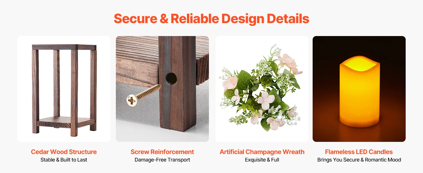 Design estetico: questa lanterna nuziale in legno presenta una corona di champagne artificiale e candele LED per una luce calda e romantica. Realizzata con una finitura carbonizzata con venature naturali in legno marrone scuro, per matrimoni