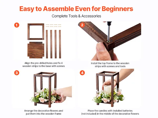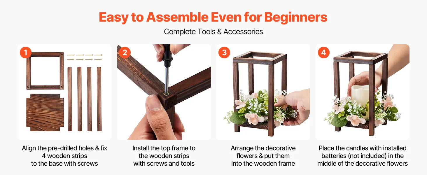 Queste lanterne in legno sono dotate di viti, utensili e un manuale d'uso illustrato e dettagliato. Il processo di installazione è chiaro e semplice, senza bisogno di utensili aggiuntivi. Anche i principianti possono completare il montaggio e la disposizione della lanterna con facilità.