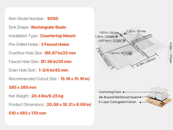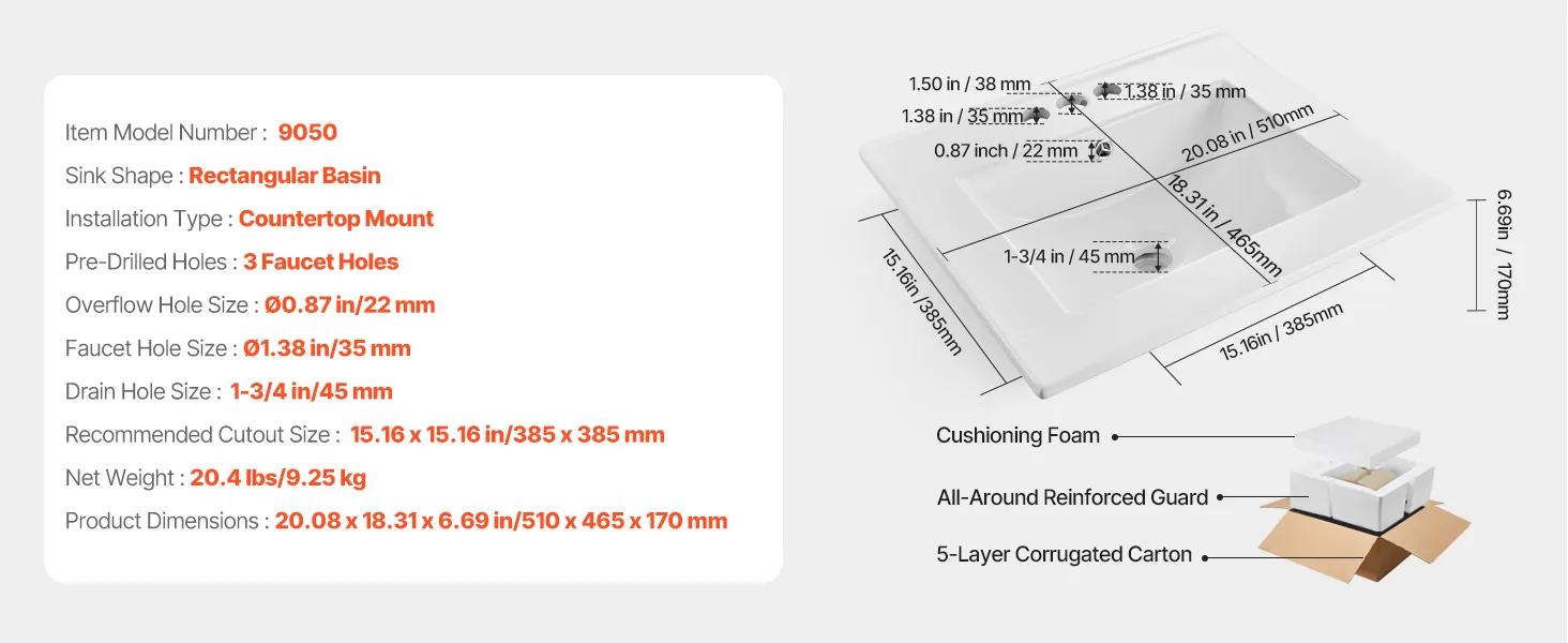 Imballaggio protettivo a cinque strati: imballato in una robusta scatola di cartone ondulato a cinque strati con imbottitura in schiuma extra spessa all'interno, questo lavabo da incasso è ben protetto da urti e vibrazioni durante il trasporto
