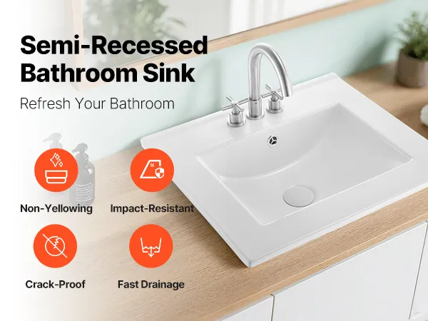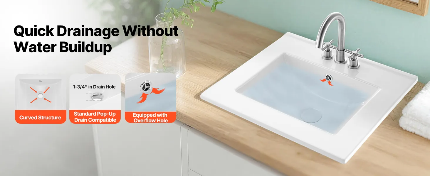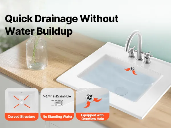 Scarico rapido: dotato di un lavabo rettangolare e di un ampio foro di scarico, questo lavabo semi-incassato si adatta alla maggior parte degli scarichi standard. Il design curvo del fondo garantisce un flusso d'acqua rapido senza ristagni