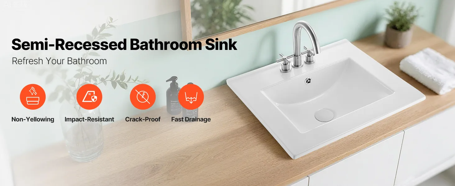 VEVOR Lavabo Semi Incasso in Ceramica da Appoggio 510 x 465 mm con 3 Fori Preforati, Lavabo Moderno per Cucina Bagno nel Piano di Lavoro, Foro del Rubinetto 35 mm, Lavello Bianco