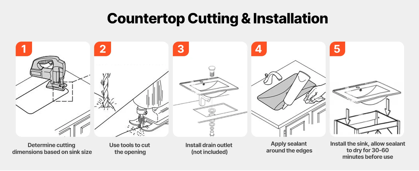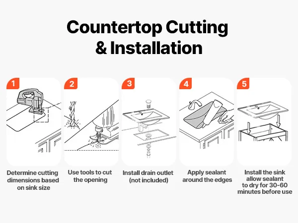 Questo lavabo richiede tagli precisi nel piano di lavoro prima dell'installazione. Si consiglia di effettuare misurazioni e tagli professionali in base alle dimensioni effettive del lavabo. Assicurarsi di sigillare adeguatamente i bordi per evitare danni causati da infiltrazioni d'acqua.