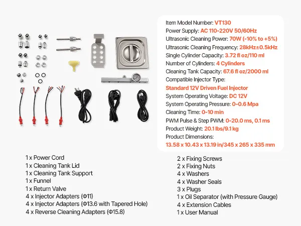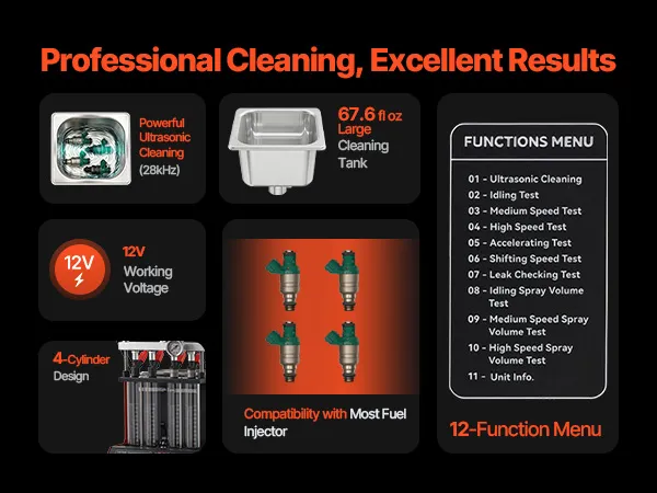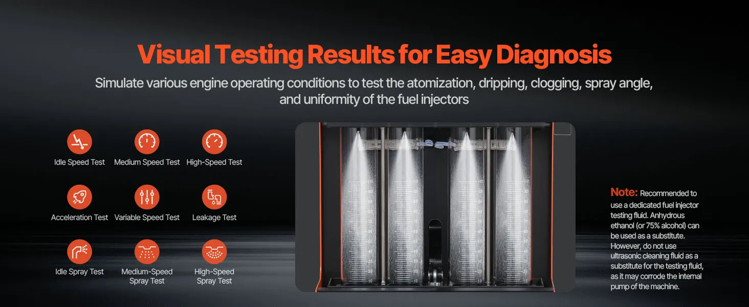 Pulizia efficiente: il tester per la pulizia degli iniettori di carburante utilizza la tecnologia a ultrasuoni per rimuovere i depositi carboniosi ostinati dagli iniettori. Il suo ampio serbatoio di pulizia da 67,64 once (circa 200 ml)