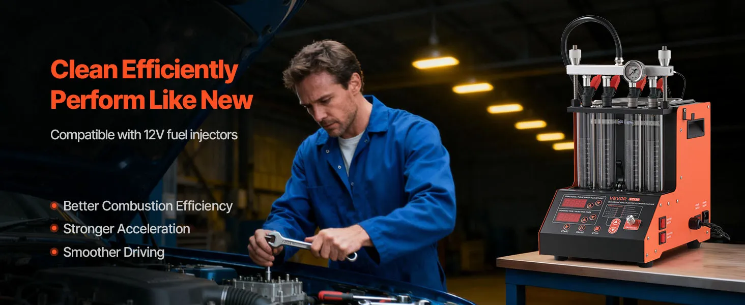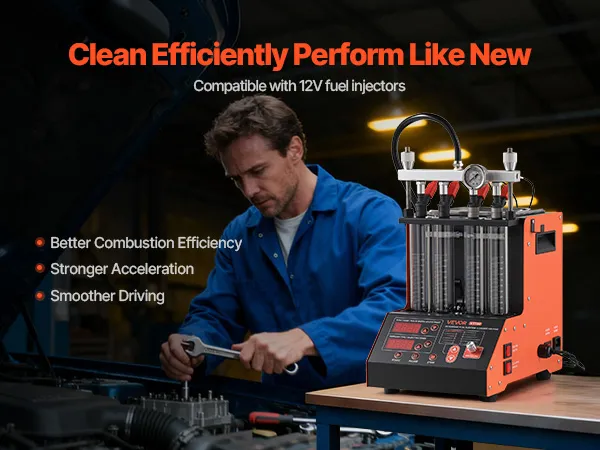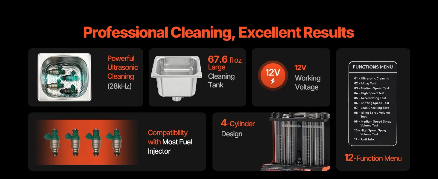 VEVOR Tester per la Pulizia degli Iniettori di Carburante 9 Modalità di Test, Macchina per la Pulizia a Ultrasuoni a 4 Cilindri, con Valvola di Scarico e Tensione di Lavoro a 12 V per Auto e Moto
