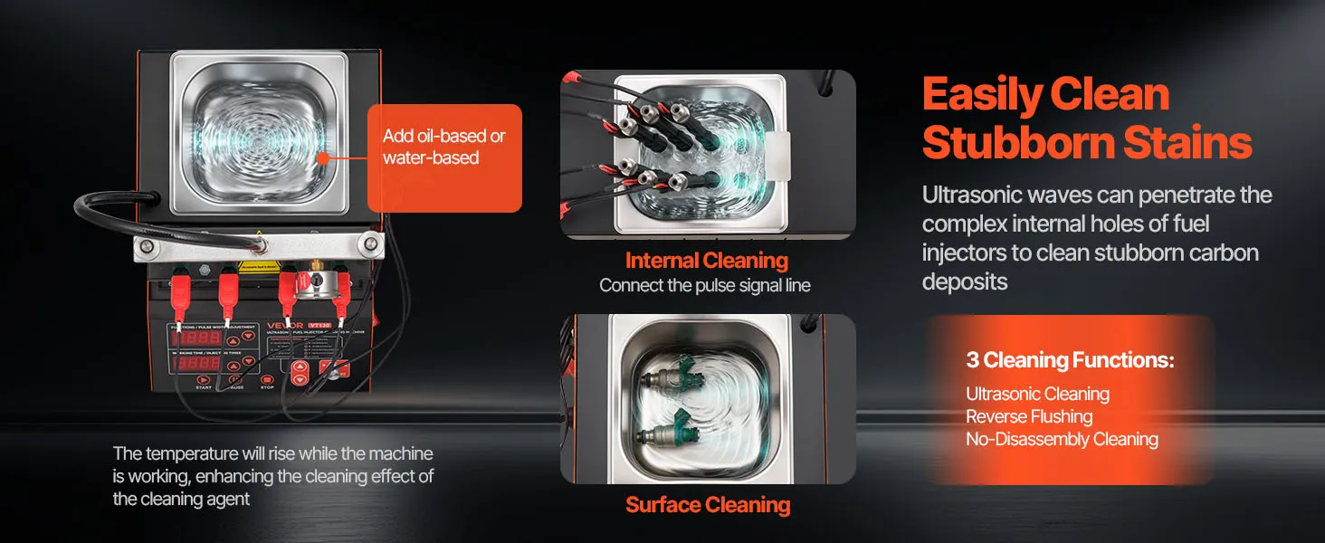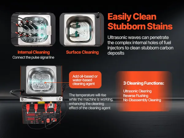 Il nostro tester per la pulizia degli iniettori di carburante a ultrasuoni utilizza onde ultrasoniche per penetrare nei complessi fori interni degli iniettori di carburante e pulire i depositi di carbonio più ostinati.