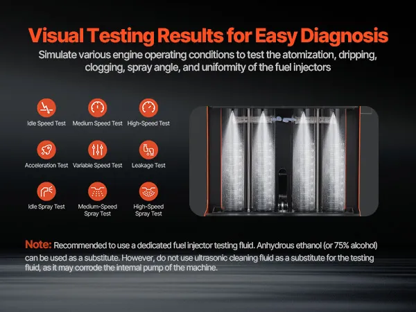 9 funzioni di test: simulando diverse condizioni operative del motore, la nostra macchina per la pulizia degli iniettori può testare l'atomizzazione, il gocciolamento, l'intasamento, l'angolo di spruzzo e l'uniformità degli iniettori
